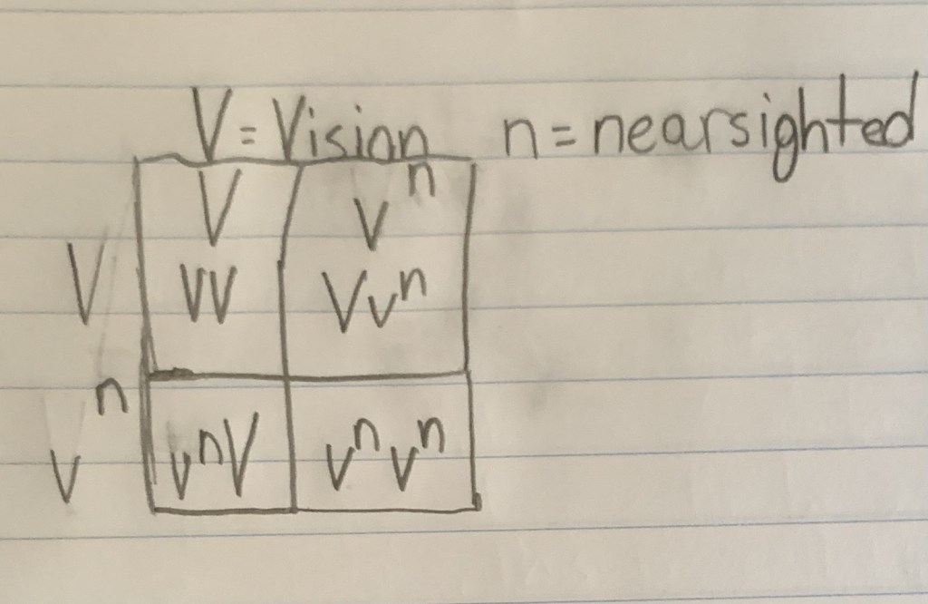 In the Punnett square above, 3 kids will have regular vision, as there is at least one dominant gene with regular vision, and one kid will be nearsighted as both are recessive. Both parents have heterozygotes, so it is the same principle as the parents with brown eyes and blue eyes.