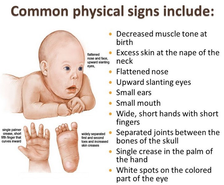 Down syndrome occurs when the 21nd chromosome is partially or fully copied, making individuals with the disorder develop differently. Some symptoms include eyes slanting upward, a shorter neck, small eyes mouth nose and ears, and flattened facial features.